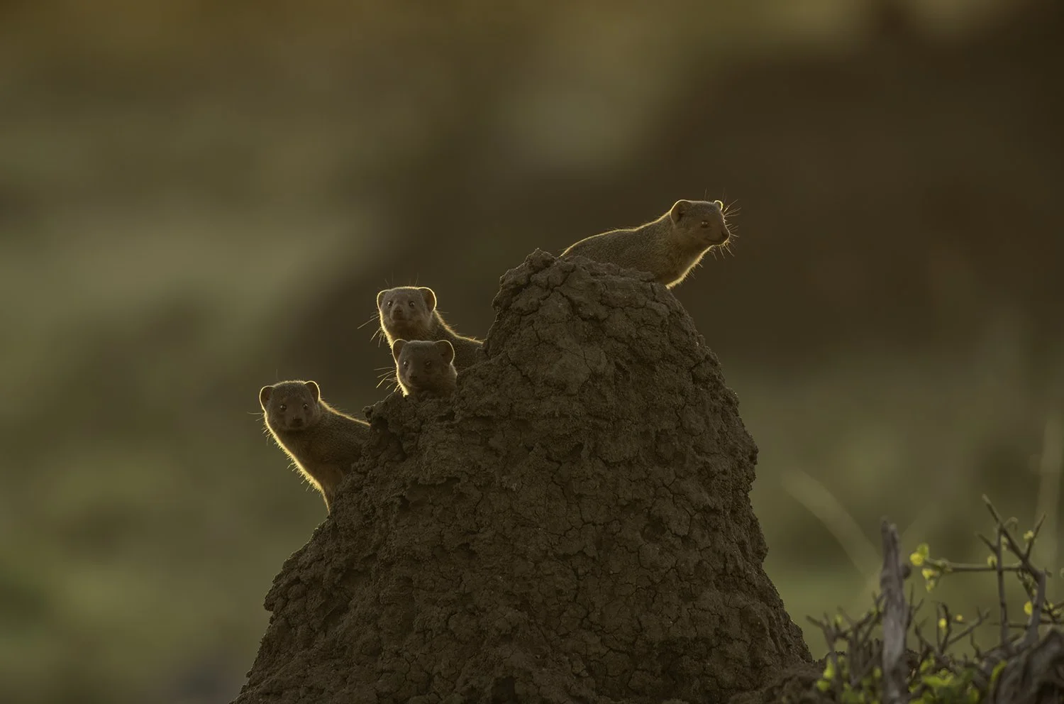 Dwarf mongooses on termite mound